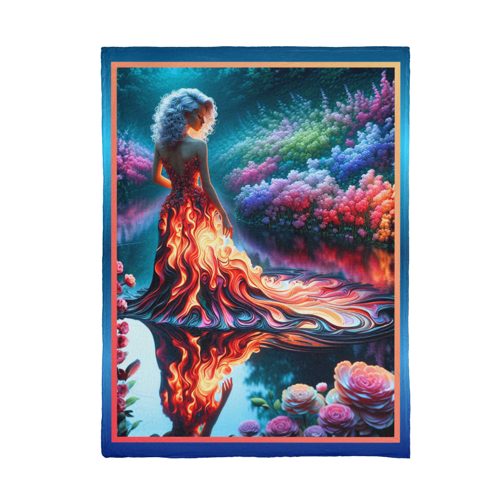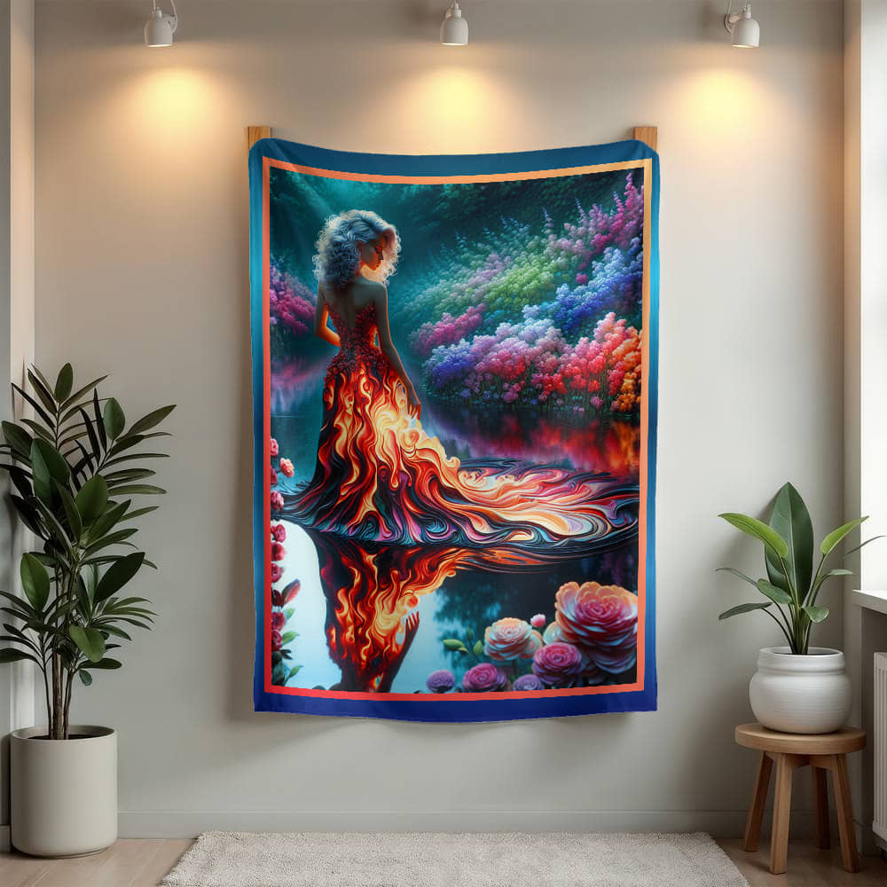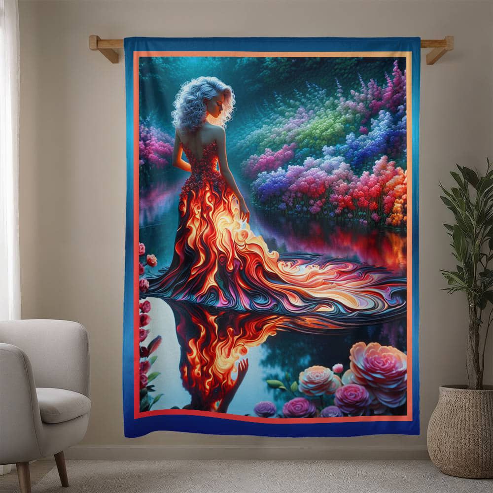Alive with light and motion, Firesong captures the meeting of flame and reflection in a moment of quiet reverence. A woman stands at the water’s edge, her gown a cascade of living fire that ripples into a mirrored stream of color and glow. Printed on luxuriously soft minky fabric, the design’s fiery tones blend seamlessly with the cool blues and florals that surround her. Warm, radiant, and endlessly captivating, it brings art and emotion into perfect harmony.