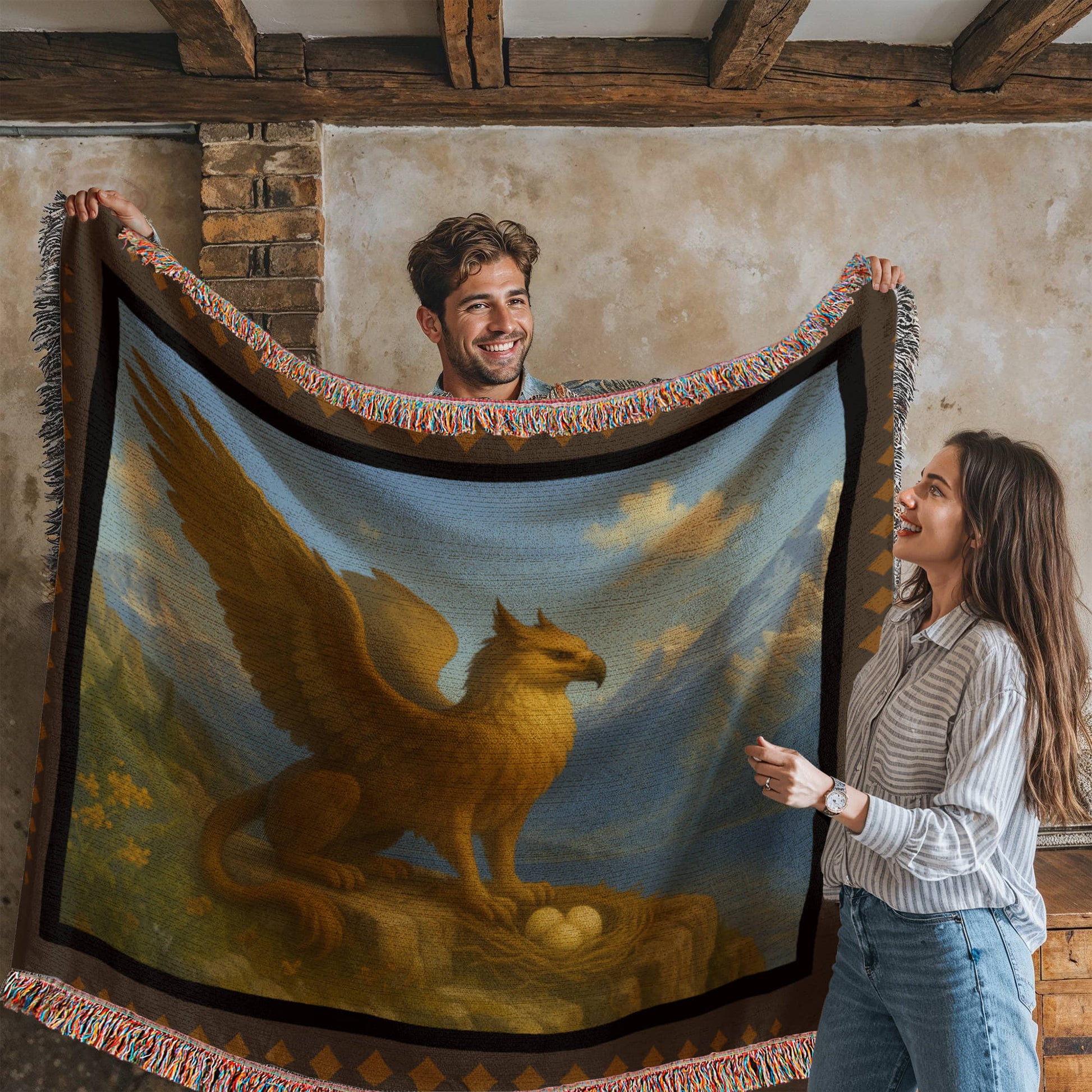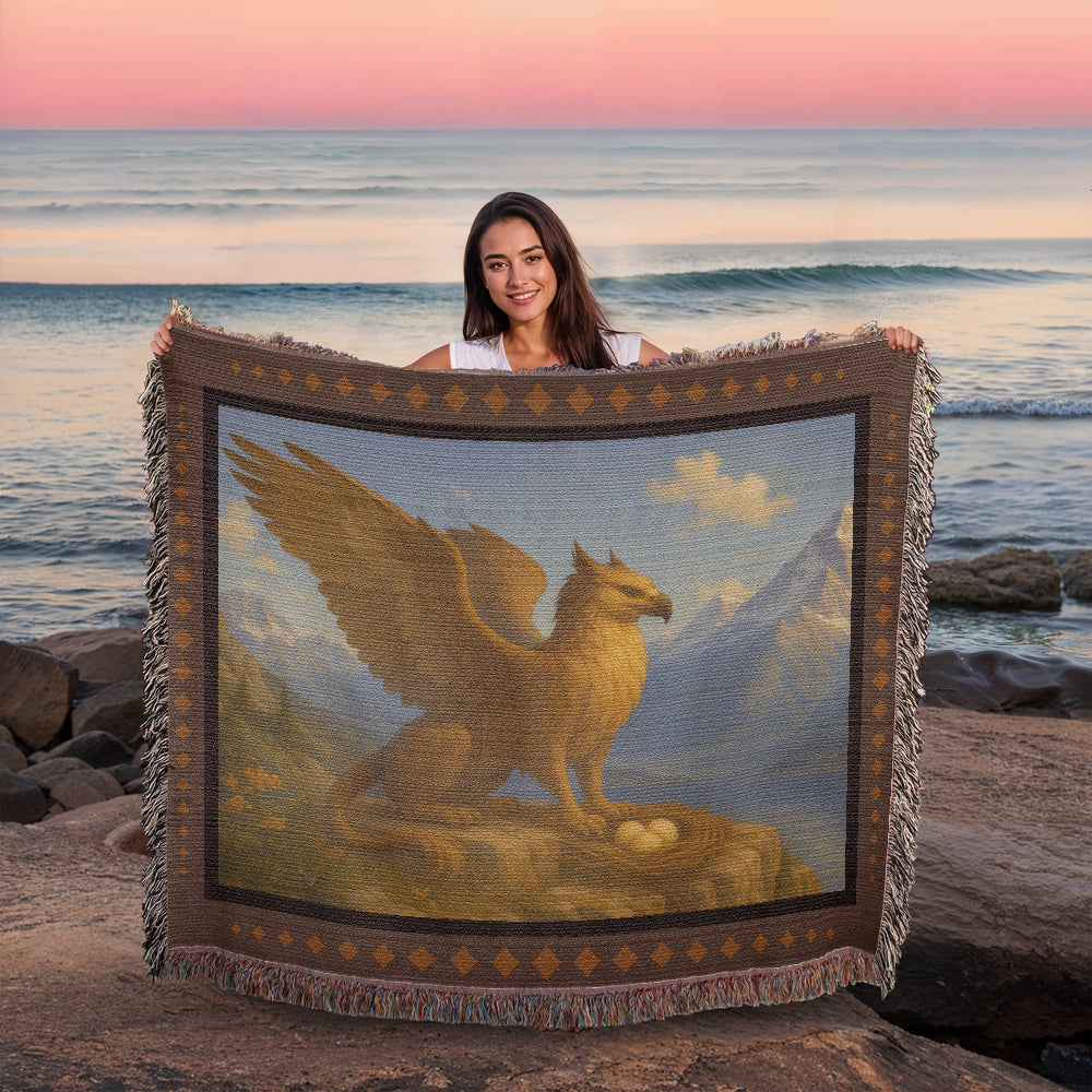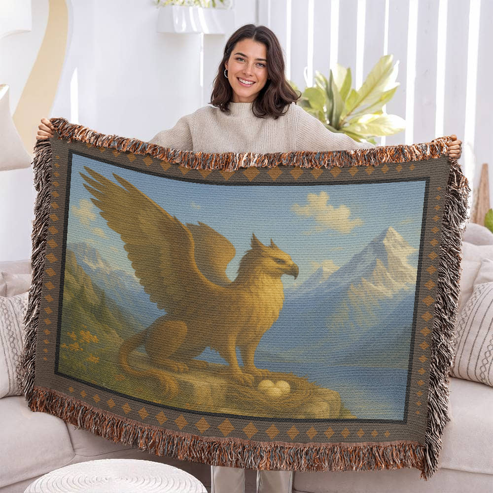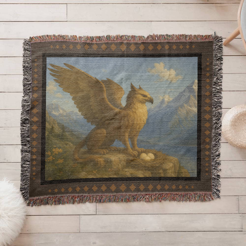 Proud and steadfast, Vigil on the Ledge depicts a griffin keeping watch from its mountain aerie. The golden light of dawn reflects across its feathers, illuminating calm strength and noble grace. The distant peaks and open sky evoke timeless guardianship and peace. Woven in soft, natural hues, it embodies loyalty, courage, and quiet majesty.